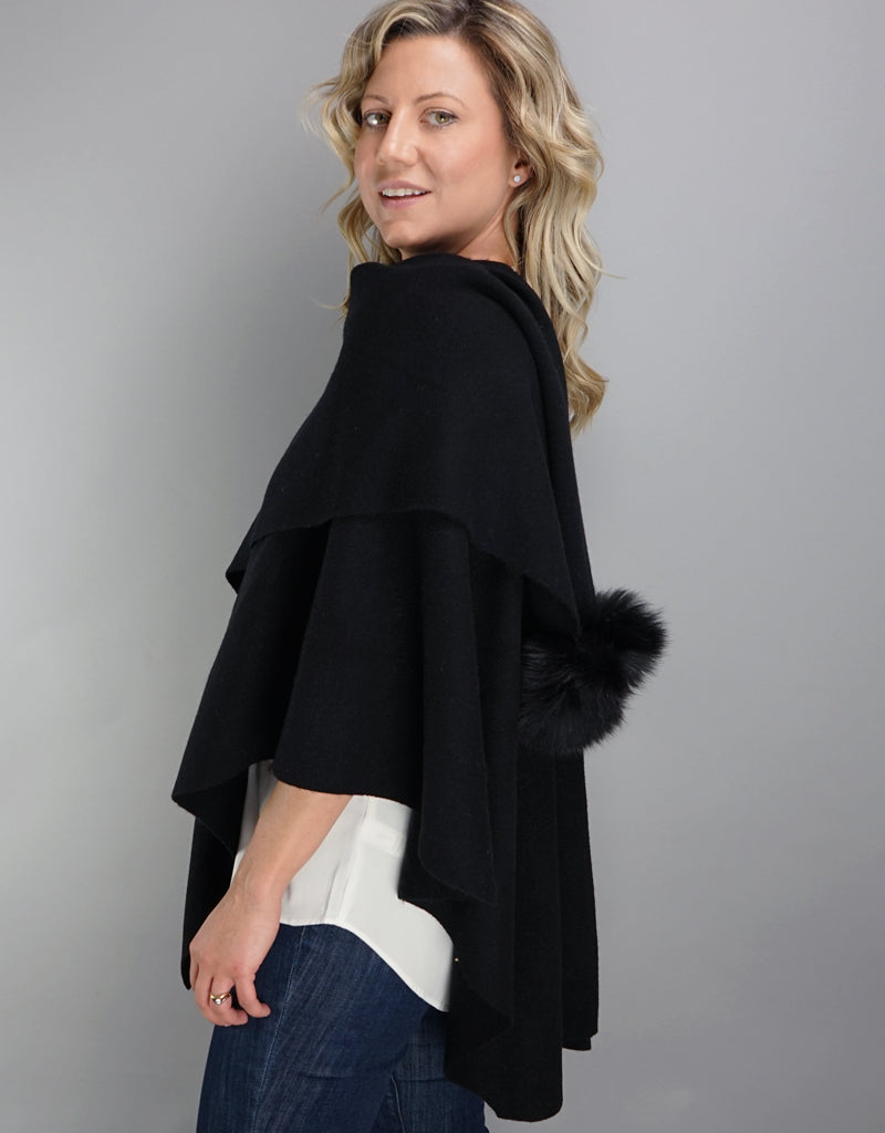 Made of 100% wool, this stunning wrap is a wardrobe must-have. Subtly accented with genuine fur trim, this versatile piece can be worn with the loop “pull thru” for a hands-free option or as an open poncho or shawl for a more casual look. The one-size shawl is perfect to pair with your favourite jeans, for travel or an evening out!