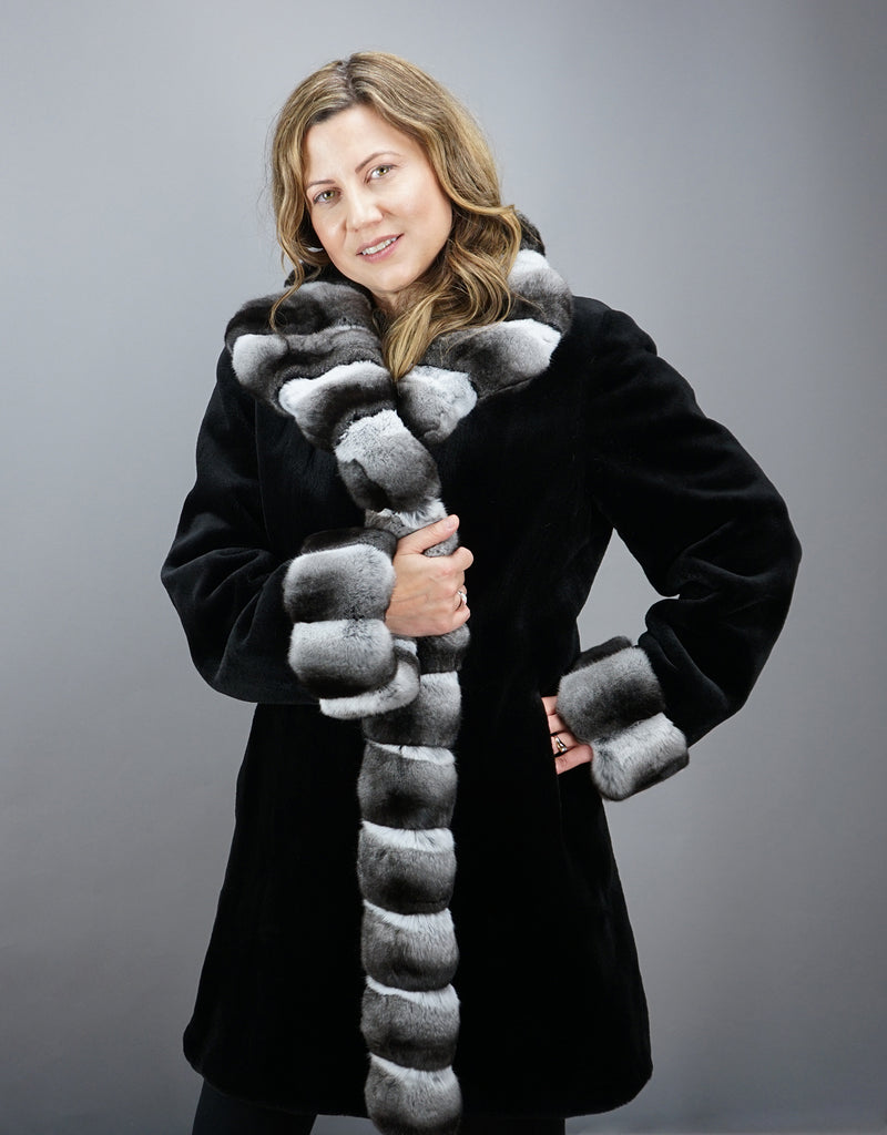 This exquisite sheared mink coat is both luxurious and stylish! Rich chinchilla fur trims the collar, cuffs, and front, elevating any ensemble. Step out in style this season with this timeless wardrobe must-have!