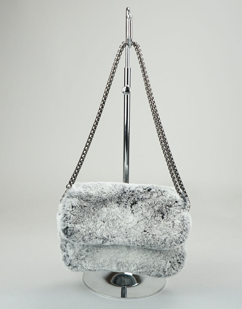Experience elegance with our genuine rex rabbit clutch, featuring a sculpted curved base and magnetic flap closure. It also includes a removable silver toned chain strap for versatile day-to-evening wear. Plus, keep your essentials secure with an internal zip pocket.